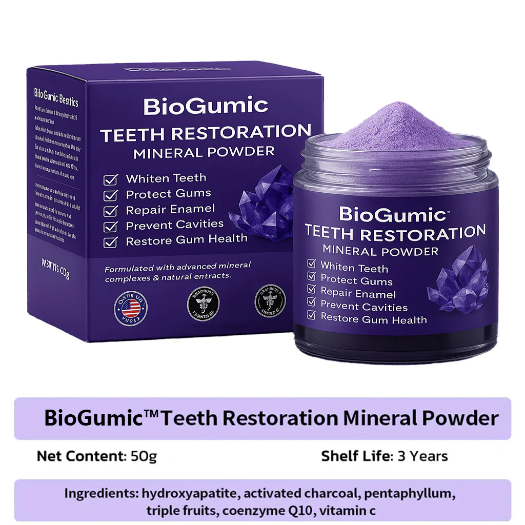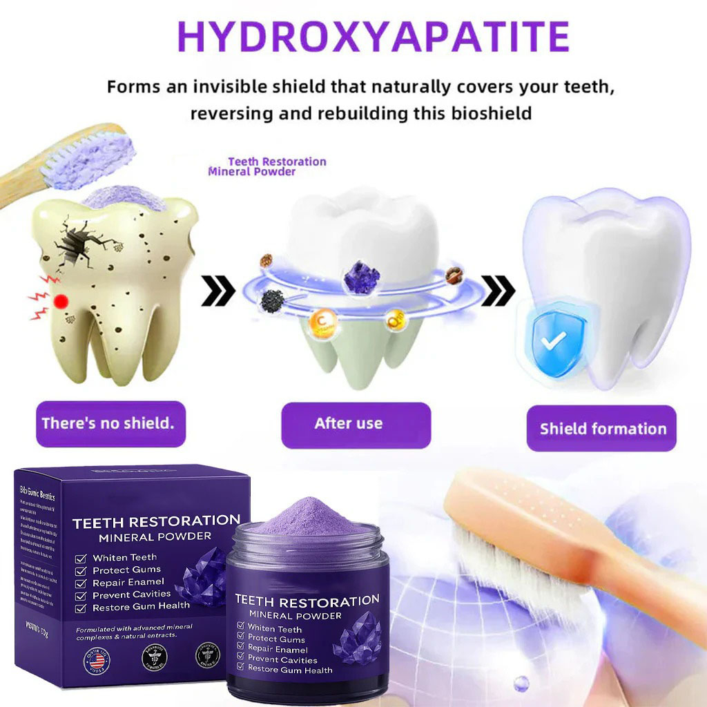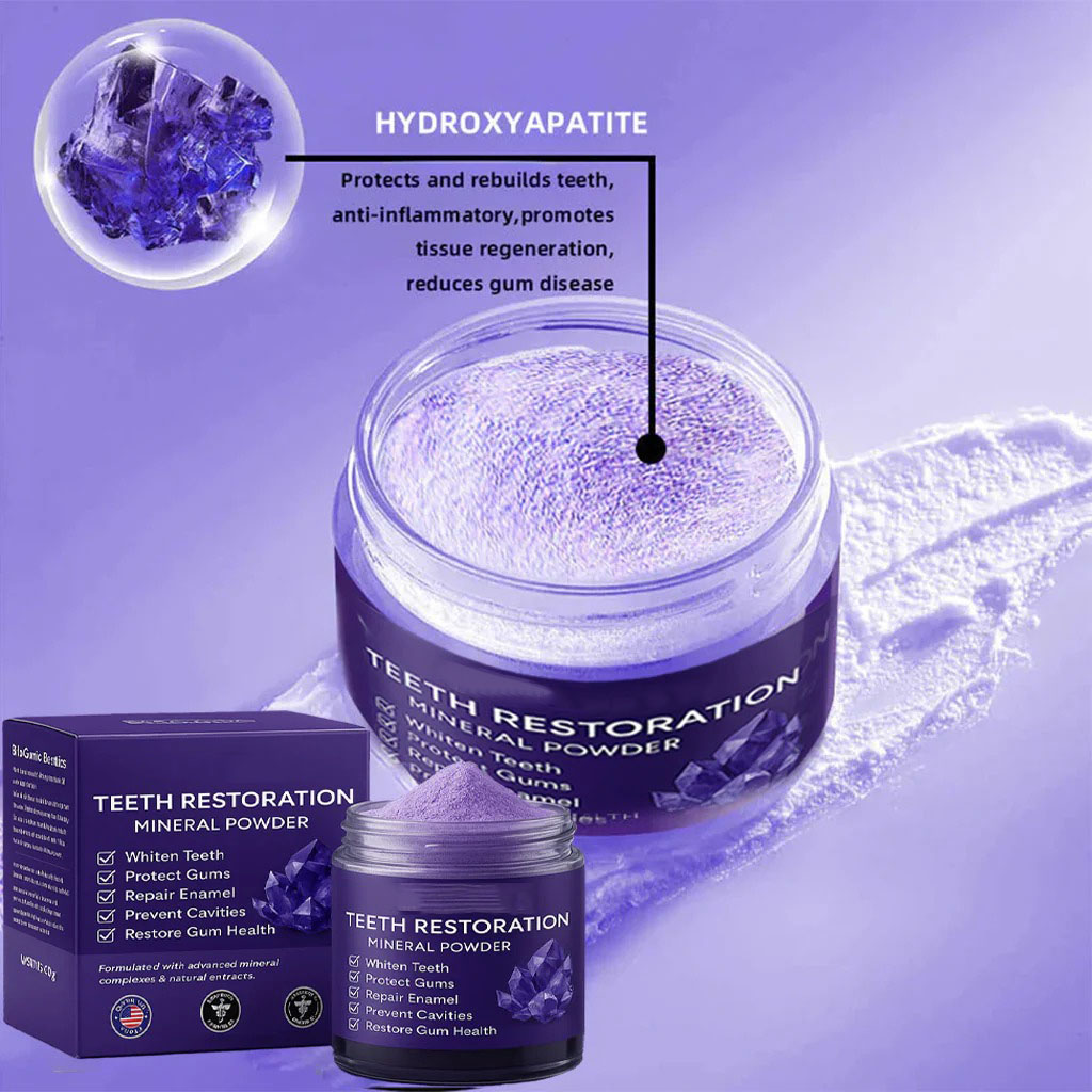 Teeth Restoration Mineral Powder is a clinically inspired oral health solution, designed to address the most common and persistent dental problems at their root cause. Its advanced mineral-repair formula not only eliminates 99.99% of harmful oral bacteria, but also actively supports the natural healing and regeneration of teeth and gums.